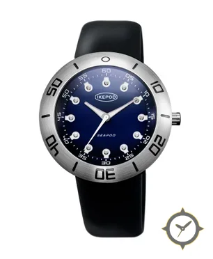 Eine Taucheruhr-Uhr mit einem markanten 50mm Auftritt am Handgelenk, gefertigt aus Edelstahl mit einem Zifferblatt in blau und einer besonderen "sunburst"-Oberfläche.