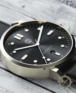 Eine Minimalistisch-Uhr mit einem vielseitigen 40.5mm Gehäuse, das an fast jedes Handgelenk passt, gefertigt aus Edelstahl mit einem Zifferblatt in schwarz und einer besonderen "sunburst"-Oberfläche.