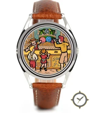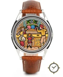 Eine Vintage-Uhr mit einem markanten 42mm Auftritt am Handgelenk, gefertigt aus Edelstahl mit einem Zifferblatt in braun und einer besonderen "printed cartoon illustration"-Oberfläche.