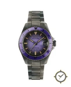 Eine Taucheruhr-Uhr mit einem markanten 45.5mm Auftritt am Handgelenk, gefertigt aus Edelstahl mit einem Zifferblatt in lila und einer besonderen "sunburst gradient"-Oberfläche.