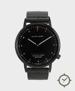 Eine Minimalistisch-Uhr mit einem markanten 49mm Auftritt am Handgelenk, gefertigt aus Edelstahl mit einem Zifferblatt in schwarz und einer besonderen "matte"-Oberfläche.