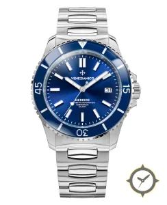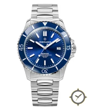 Eine Taucheruhr-Uhr mit einem vielseitigen 38.5mm Gehäuse, das an fast jedes Handgelenk passt, gefertigt aus Edelstahl mit einem Zifferblatt in blau und einer besonderen "sunburst (brushed gradient)"-Oberfläche.