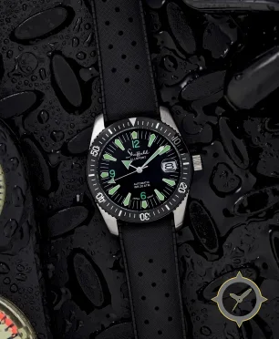 Eine Taucheruhr-Uhr mit einem 33.5mm Gehäuse im Vintage-Stil gefertigt aus Edelstahl mit einem Zifferblatt in schwarz und einer besonderen "glossy"-Oberfläche.