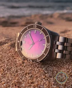 Eine Taucheruhr-Uhr mit einem 37mm Gehäuse im Vintage-Stil gefertigt aus Edelstahl mit einem Zifferblatt in lila und einer besonderen "mirror-reflective"-Oberfläche.