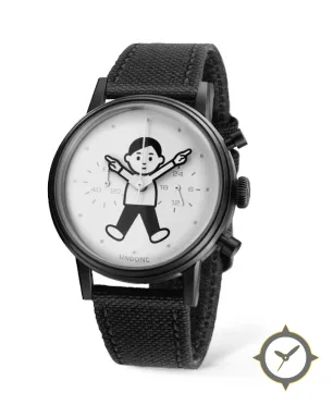 Eine Minimalistisch-Uhr mit einem 35mm Gehäuse im Vintage-Stil gefertigt aus Edelstahl mit einem Zifferblatt in weiß und einer besonderen "matte painted dial with printed illustration"-Oberfläche.