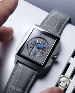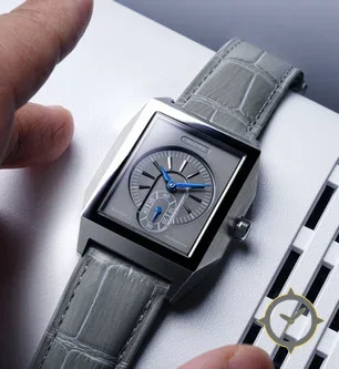 Eine Dress-Uhr mit einem 35mm Gehäuse im Vintage-Stil gefertigt aus Edelstahl mit einem Zifferblatt in grau und einer besonderen "guilloché center with subtle sunburst chapter ring"-Oberfläche.