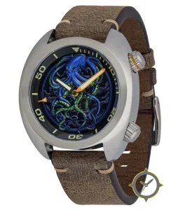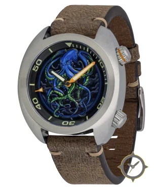 Eine Taucheruhr-Uhr mit einem markanten 51mm Auftritt am Handgelenk, gefertigt aus Edelstahl mit einem Zifferblatt in blau und einer besonderen "printed/illustrated octopus motif on a dark (black) background"-Oberfläche.