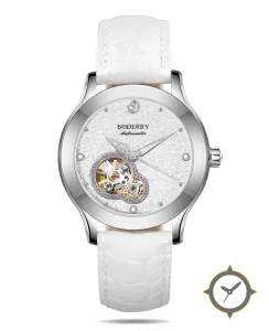 Eine Skelett-Uhr mit einem 36.5mm Gehäuse im Vintage-Stil gefertigt aus Edelstahl mit einem Zifferblatt in weiß und einer besonderen "glitter/sparkle"-Oberfläche.