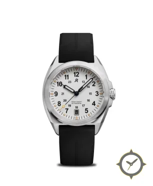 Eine Field-Uhr mit einem vielseitigen 39mm Gehäuse, das an fast jedes Handgelenk passt, gefertigt aus Edelstahl mit einem Zifferblatt in weiß und einer besonderen "matte"-Oberfläche.