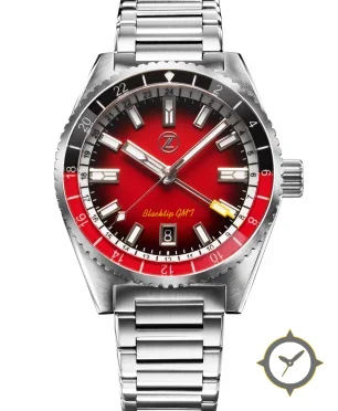 Eine GMT-Uhr mit einem 34.5mm Gehäuse im Vintage-Stil gefertigt aus Edelstahl mit einem Zifferblatt in rot und einer besonderen "sunburst"-Oberfläche und einer echten GMT-Funktion, mit der du eine zweite Zeitzone verfolgen kannst.