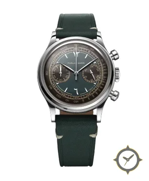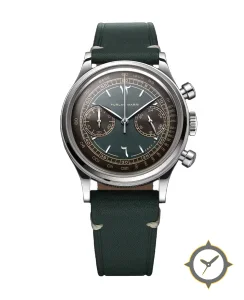 Eine Chronograph-Uhr mit einem vielseitigen 40mm Gehäuse, das an fast jedes Handgelenk passt, gefertigt aus Edelstahl mit einem Zifferblatt in grün und einer besonderen "fumé/gradient sunburst"-Oberfläche.