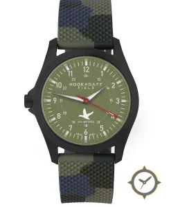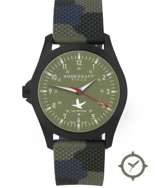 Eine Field-Uhr mit einem markanten 48.5mm Auftritt am Handgelenk, gefertigt aus Edelstahl mit einem Zifferblatt in grün und einer besonderen "matte"-Oberfläche.