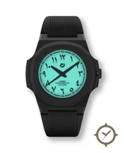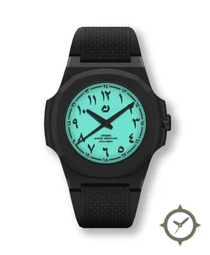 Eine Sport-Uhr mit einem markanten 48mm Auftritt am Handgelenk, gefertigt aus Harz mit einem Zifferblatt in türkis und einer besonderen "luminous"-Oberfläche.