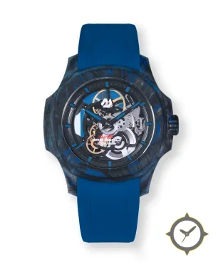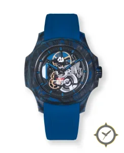 Eine Skelett-Uhr mit einem markanten 47mm Auftritt am Handgelenk, gefertigt aus Carbon mit einem Zifferblatt in schwarz und einer besonderen "open-work skeleton with visible movement and metallic gears"-Oberfläche.