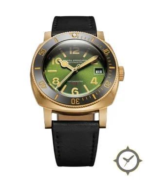Eine Taucheruhr-Uhr mit einem 35.5mm Gehäuse im Vintage-Stil gefertigt aus Bronze mit einem Zifferblatt in grün und einer besonderen "sunburst"-Oberfläche.