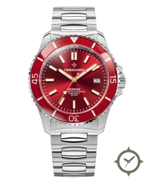 Eine Taucheruhr-Uhr mit einem markanten 43.5mm Auftritt am Handgelenk, gefertigt aus Edelstahl mit einem Zifferblatt in rot und einer besonderen "sunburst"-Oberfläche.