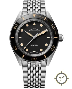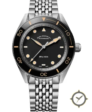 Eine Taucheruhr-Uhr mit einem vielseitigen 39mm Gehäuse, das an fast jedes Handgelenk passt, gefertigt aus Edelstahl mit einem Zifferblatt in schwarz und einer besonderen "matte"-Oberfläche.