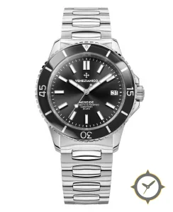 Eine Taucheruhr-Uhr mit einem markanten 41.5mm Auftritt am Handgelenk, gefertigt aus Edelstahl mit einem Zifferblatt in schwarz und einer besonderen "sunburst"-Oberfläche.