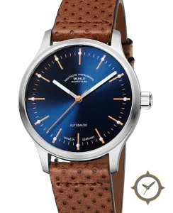 Eine Minimalistisch-Uhr mit einem 35mm Gehäuse im Vintage-Stil gefertigt aus Edelstahl mit einem Zifferblatt in blau und einer besonderen "sunburst"-Oberfläche.