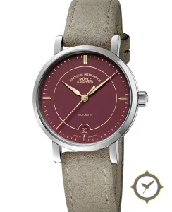 Eine Dress-Uhr mit einem 35.5mm Gehäuse im Vintage-Stil gefertigt aus Edelstahl mit einem Zifferblatt in karmesinrot und einer besonderen "matte"-Oberfläche.