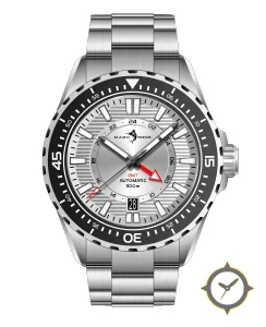 Eine GMT-Uhr mit einem markanten 51.5mm Auftritt am Handgelenk, gefertigt aus Edelstahl mit einem Zifferblatt in silber und einer besonderen "brushed finish with sunburst center and horizontal striping on outer ring"-Oberfläche und einer echten GMT-Funktion, mit der du eine zweite Zeitzone verfolgen kannst.