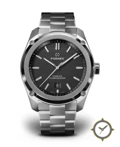 Eine Sport-Uhr mit einem vielseitigen 40mm Gehäuse, das an fast jedes Handgelenk passt, gefertigt aus Edelstahl mit einem Zifferblatt in schwarz und einer besonderen "subtle horizontal grid texture"-Oberfläche.