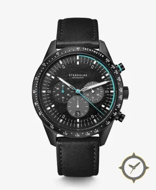 Eine Chronograph-Uhr mit einem markanten 45.5mm Auftritt am Handgelenk, gefertigt aus Edelstahl mit einem Zifferblatt in schwarz und einer besonderen "brushed / lightly distressed texture"-Oberfläche.