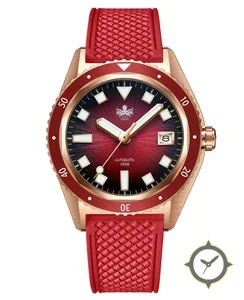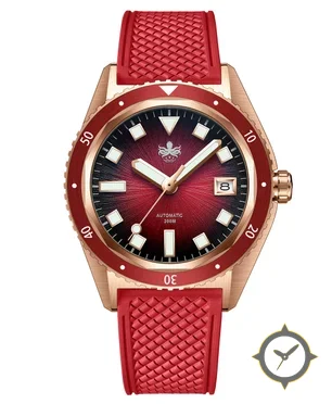 Eine Taucheruhr-Uhr mit einem markanten 41.5mm Auftritt am Handgelenk, gefertigt aus Gold mit einem Zifferblatt in rot und einer besonderen "radial sunburst (fumé gradient)"-Oberfläche.