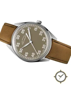Eine Pilot-Uhr mit einem markanten 44mm Auftritt am Handgelenk, gefertigt aus Edelstahl mit einem Zifferblatt in braun und einer besonderen "matte"-Oberfläche.