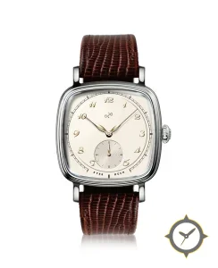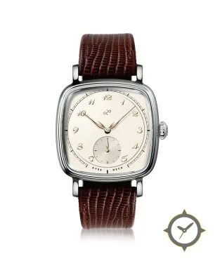 Eine Dress-Uhr mit einem 31mm Gehäuse im Vintage-Stil gefertigt aus Edelstahl mit einem Zifferblatt in weiß und einer besonderen "smooth matte cream finish"-Oberfläche.