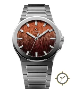 Eine Sport-Uhr mit einem markanten 42mm Auftritt am Handgelenk, gefertigt aus Edelstahl mit einem Zifferblatt in braun und einer besonderen "textured, wood-grain / hammered finish"-Oberfläche.