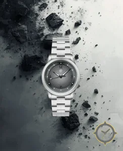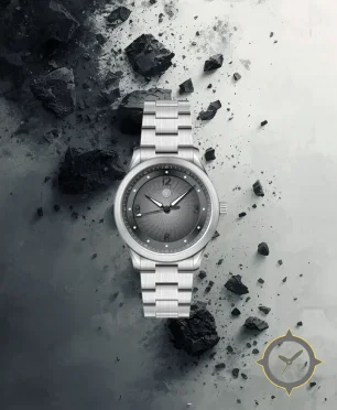Eine Sport-Uhr mit einem 34.5mm Gehäuse im Vintage-Stil gefertigt aus Edelstahl mit einem Zifferblatt in grau und einer besonderen "guilloche wave"-Oberfläche.