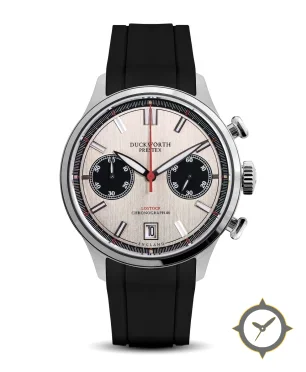 Eine Chronograph-Uhr mit einem markanten 46mm Auftritt am Handgelenk, gefertigt aus Edelstahl mit einem Zifferblatt in silber und einer besonderen "brushed (vertical)"-Oberfläche.