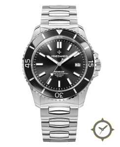 Eine Taucheruhr-Uhr mit einem markanten 46mm Auftritt am Handgelenk, gefertigt aus Edelstahl mit einem Zifferblatt in schwarz und einer besonderen "sunburst"-Oberfläche.