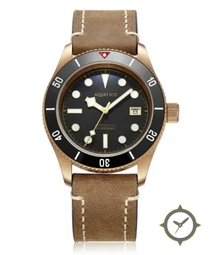 Eine Taucheruhr-Uhr mit einem markanten 43mm Auftritt am Handgelenk, gefertigt aus Bronze mit einem Zifferblatt in schwarz und einer besonderen "matte"-Oberfläche.