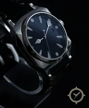 Eine Dress-Uhr mit einem markanten 47.5mm Auftritt am Handgelenk, gefertigt aus Edelstahl mit einem Zifferblatt in marineblau und einer besonderen "radial sunburst"-Oberfläche.