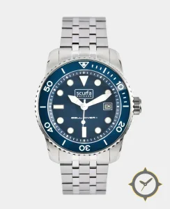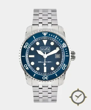 Eine Taucheruhr-Uhr mit einem markanten 50.5mm Auftritt am Handgelenk, gefertigt aus Edelstahl mit einem Zifferblatt in blau und einer besonderen "sunburst"-Oberfläche.