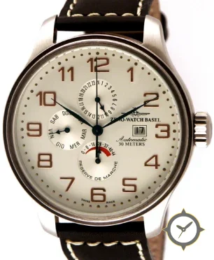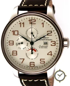 Eine Pilot-Uhr gefertigt aus Edelstahl mit einem Zifferblatt in weiß und einer besonderen "matte"-Oberfläche und einer praktischen Gangreserveanzeige.