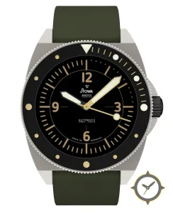 Eine Taucheruhr-Uhr mit einem markanten 43.5mm Auftritt am Handgelenk, gefertigt aus Edelstahl mit einem Zifferblatt in schwarz und einer besonderen "matte"-Oberfläche.