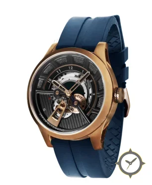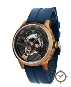 Eine Skelett-Uhr mit einem markanten 46.5mm Auftritt am Handgelenk, gefertigt aus Gold mit einem Zifferblatt in schwarz und einer besonderen "open-worked (skeleton) with textured/grained sections"-Oberfläche.
