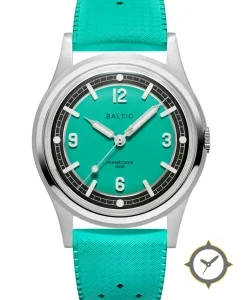 Eine Taucheruhr-Uhr mit einem 30.5mm Gehäuse im Vintage-Stil gefertigt aus Edelstahl mit einem Zifferblatt in türkis und einer besonderen "matte-grain"-Oberfläche.