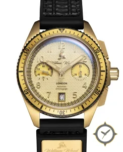 Eine Chronograph-Uhr mit einem markanten 44.5mm Auftritt am Handgelenk, gefertigt aus Gold mit einem Zifferblatt in gold und einer besonderen "guilloché (hobnail) engine-turned texture"-Oberfläche.