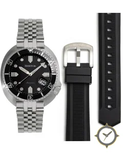 Eine Taucheruhr-Uhr mit einem markanten 43.5mm Auftritt am Handgelenk, gefertigt aus Edelstahl mit einem Zifferblatt in schwarz und einer besonderen "matte"-Oberfläche.