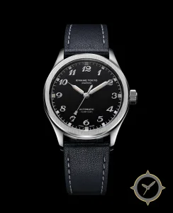 Eine Field-Uhr mit einem 35.5mm Gehäuse im Vintage-Stil gefertigt aus Edelstahl mit einem Zifferblatt in schwarz und einer besonderen "matte"-Oberfläche.