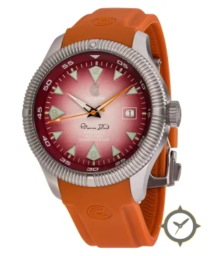 Eine Taucheruhr-Uhr mit einem vielseitigen 39mm Gehäuse, das an fast jedes Handgelenk passt, gefertigt aus Edelstahl mit einem Zifferblatt in rot und einer besonderen "fumé / sunburst gradient"-Oberfläche.
