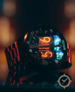 Eine Digital-Uhr gefertigt aus Edelstahl mit einem Zifferblatt in schwarz und einer besonderen "honeycomb mesh around visible nixie tubes"-Oberfläche.