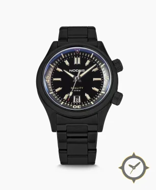 Eine Taucheruhr-Uhr mit einem 36.5mm Gehäuse im Vintage-Stil gefertigt aus Edelstahl mit einem Zifferblatt in schwarz und einer besonderen "lacquer"-Oberfläche.