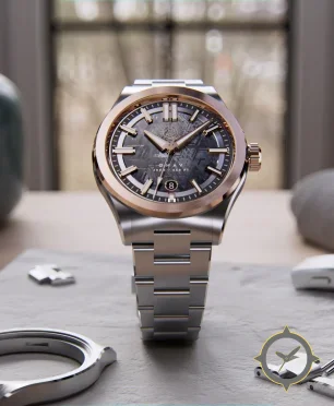 Eine Luxus-Uhr mit einem vielseitigen 38mm Gehäuse, das an fast jedes Handgelenk passt, gefertigt aus Edelstahl mit einem Zifferblatt in grau und einer besonderen "meteorite texture"-Oberfläche.