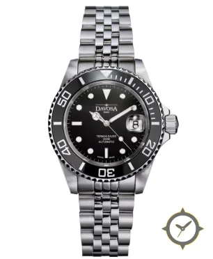 Eine Taucheruhr-Uhr mit einem markanten 47.5mm Auftritt am Handgelenk, gefertigt aus Edelstahl mit einem Zifferblatt in schwarz und einer besonderen "glossy"-Oberfläche.