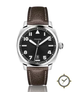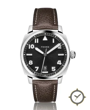 Eine Field-Uhr mit einem markanten 46mm Auftritt am Handgelenk, gefertigt aus Edelstahl mit einem Zifferblatt in schwarz und einer besonderen "sunburst"-Oberfläche.